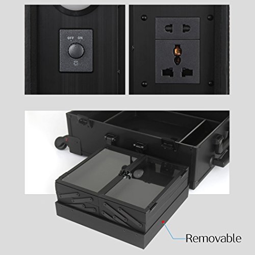 The case folds out to make room for a high-finish mirror with 6 LED bulbs with adjustable intensity and numerous foldable compartments, including a removable one to store all your make-up and professional tools.